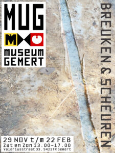 In Museum Het MUG, is vanaf zaterdag 29 november de nieuwe en bijzondere tentoonstelling: ‘Breuken en scheuren’ te zien. Negentien lokale kunstenaars uit de gemeente Gemert-Bakel hebben zich laten inspireren om  werk te leveren dat soms zelf speciaal voor dit thema gemaakt is. Daarnaast levert Heemkundekring De Kommanderij Gemert een waardevolle bijdrage: elf informatieve panelen vertellen het verhaal van de Peelrandbreuk, die dwars door de gemeente loopt.